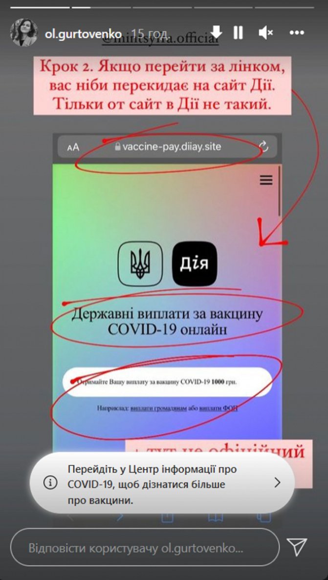 "Вам доступна виплата за вакцинацію COVID-19 1000 UAN. Підтвердити зарахування…" Далі пропонують перейти за посиланням, яке веде на фейковий сайт "Дії".