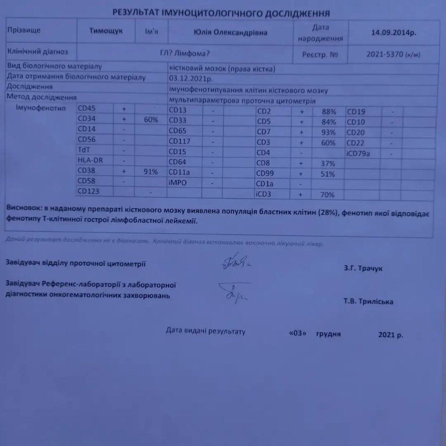 «Дорогі люди, у нас сталась велика біда. У нашої донечки Юлі діагностували рак крові. Ми шукаємо можливість лікування за кордоном. Наразі ми отримали найшвидшу згоду від Ізраїлю, тому плануємо їхати лікуватись туди.