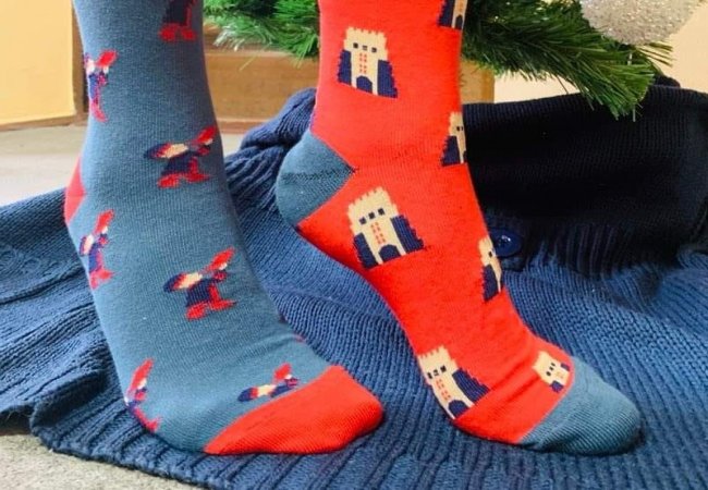 Першими в продаж надійдуть веселі шкарпетки з зображеннями В’їзної вежі Луцького замку та кликуна. Про це повідомила керівниця управління туризму та промоції міста Луцької міської ради Катерина Теліпська на своїй сторінці у фейсбуці.