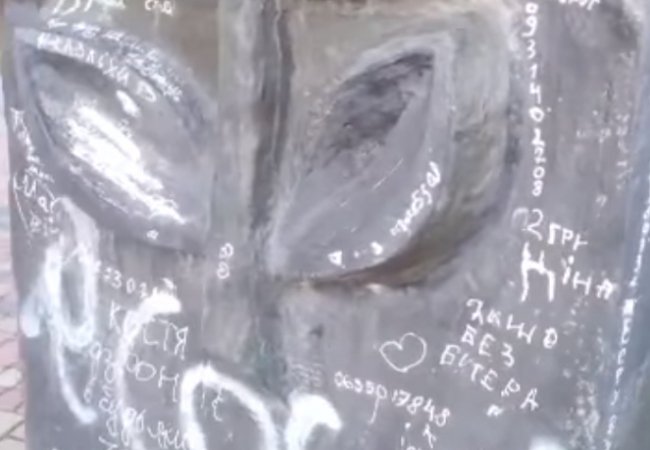 З відео видно, що пам'ятник розмальований дрібними написами, зізнаннями в коханні. Є тут і "спроби познайомитися", залишивши свій номер телефону, тощо. Крім цього на пам'ятнику є більші написи, очевидно, зроблені балончиком.