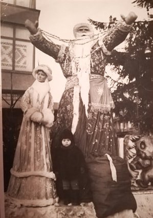 На чорно-білих фото – дорослі лучани та діти поруч із чималими фігурами Діда Мороза та Снігуроньки.