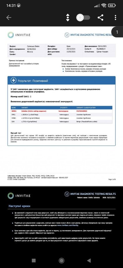 «У Волинській обласній лікарні сказали, що є підозра на СМА. Відправили аналізи на Америку. Ми заплатили $250 за аналіз. Дві тисячі за переліт. Через місяць і шість днів надійшов результат. Позитивний. У дитини зламаний ген SMN1», – каже мама дівчинки.