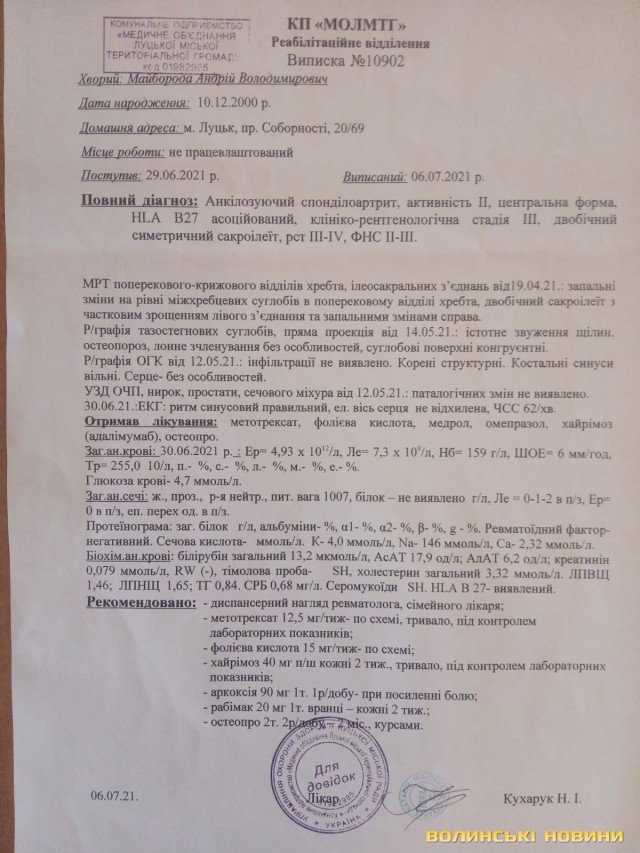 Через важку недугу кульшові суглоби 20-річного Андрія Майбороди з Луцька тонкі, наче папірець. Без рятівного препарату «Хайрімоз» хлопець страждає від болю і в свої молоді роки може залишитися повністю прикутим до ліжка. Надія на одужання є, утім коштів на дороге лікування та операцію родина не має.