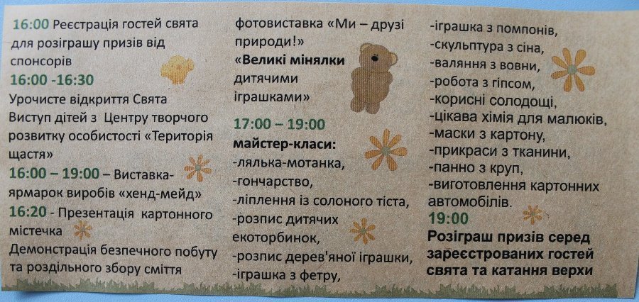 На святі намагатимуться використовувати для дитячих майстер-класів лише натуральні матеріали. Демонструватимуть, як у забавах із дітьми можна застосовувати вторинну сировину, наприклад, використані картонні коробки.