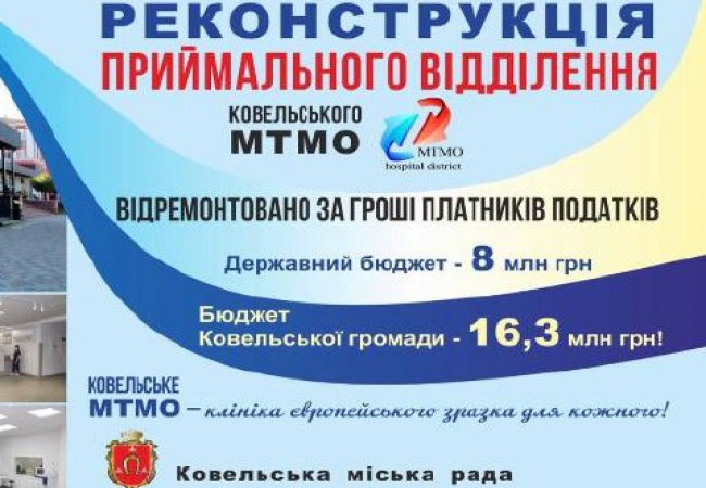 На вході до приймального відділення Ковельського МТМО з`явився новий бігборд, де оприлюднені не лише суми, за які його реконструювали: 8 млн грн. з державного бюджету і 16,3 млн грн. - з бюджету Ковельської громади, але і вперше прозвучав головний меседж: «Відремонтовано за гроші платників податків».