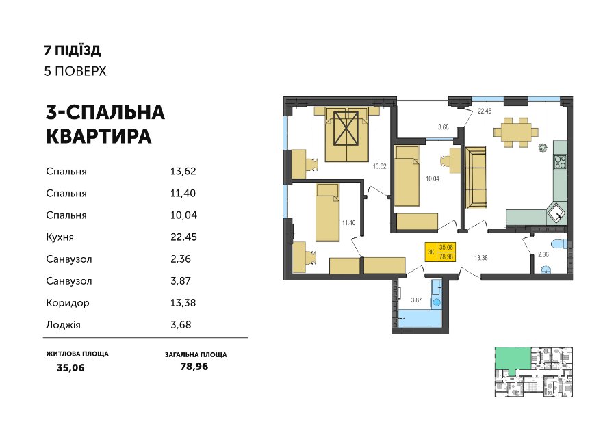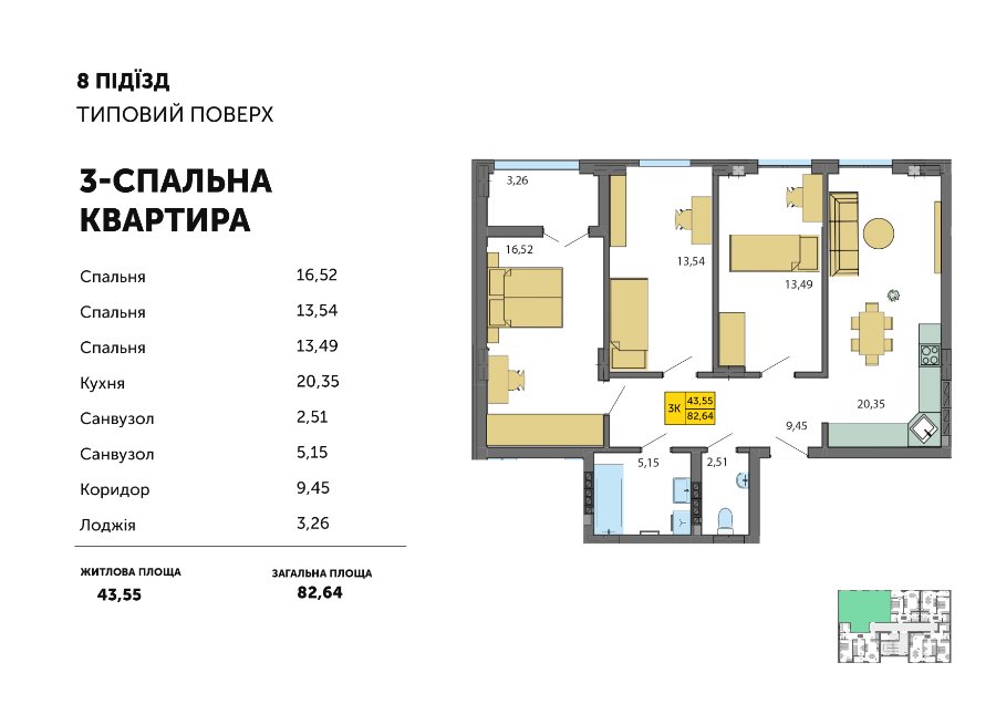 Серед нових планувань - просторі квартири із трьома спальнями площею 79,2 м2 та 82,64 м2.