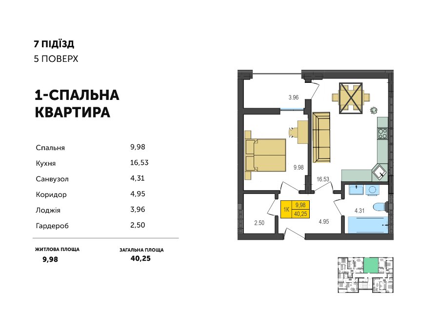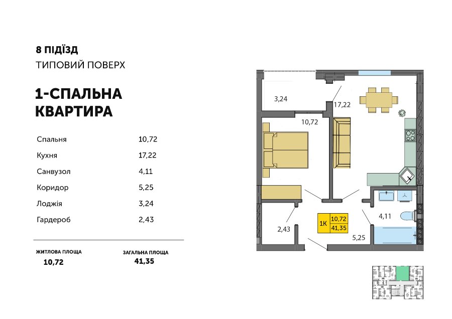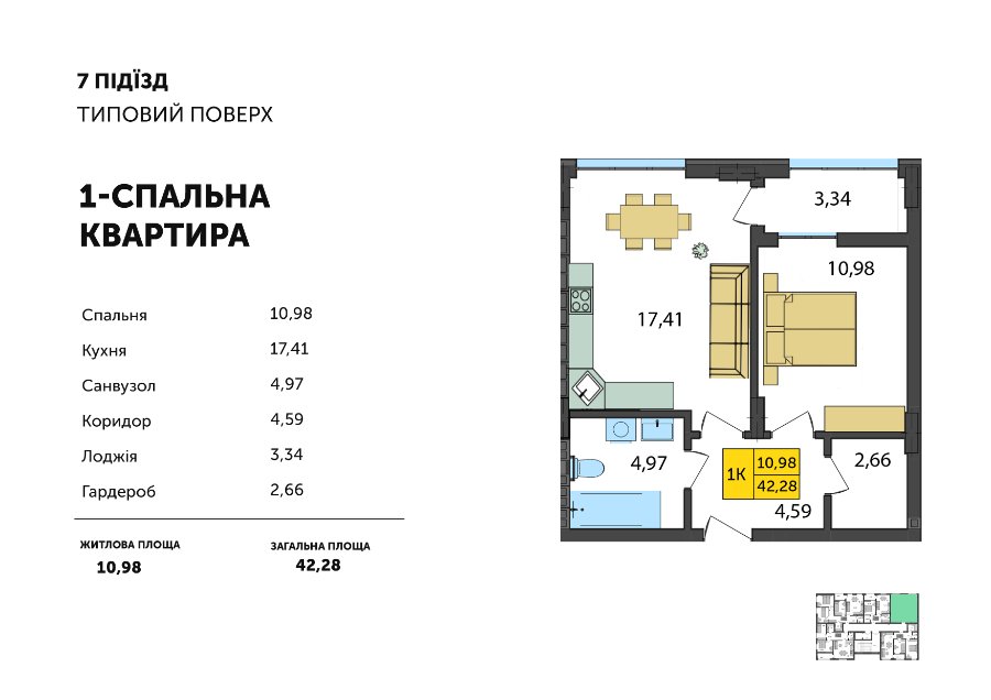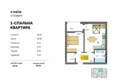 Крім того, у кожній із квартир з однією спальнею є гардеробна кімната, коридор та лоджія.