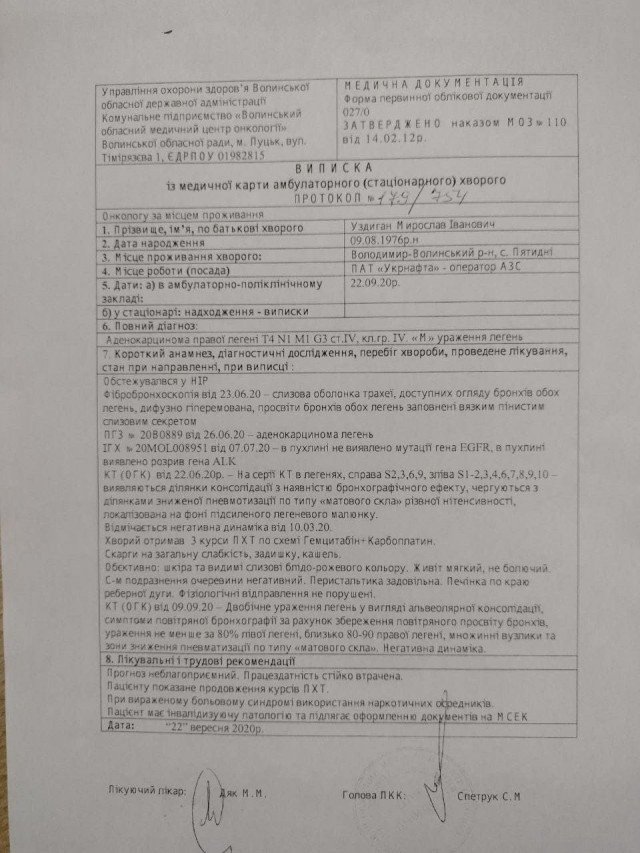 Рак легенів, аденокарциному 4 стадії, у Мирослава виявили у червні 2020 року.