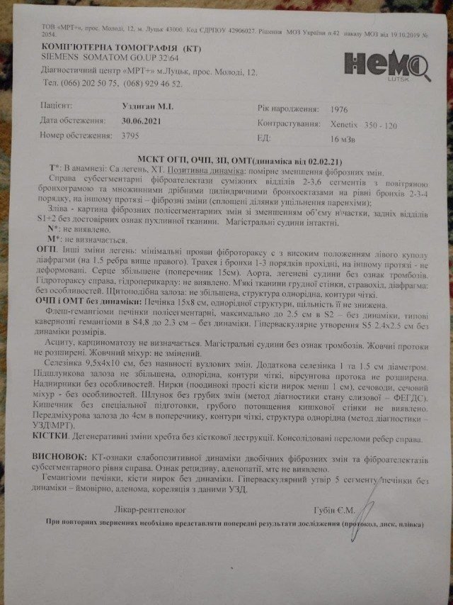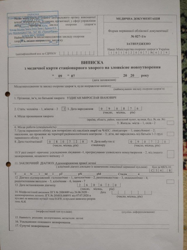 «На превеликий жаль, він неоперабельний, бо пошкоджені обидві легені до 70%. Наразі ми вже пройшли 3 хіміотерапії та вони не дали позитивних результатів. Також у пухлині виявлено АЛК+ мутацію...Та є останній вихід – це препарат Алекенза», – розповідає з надією Світлана.