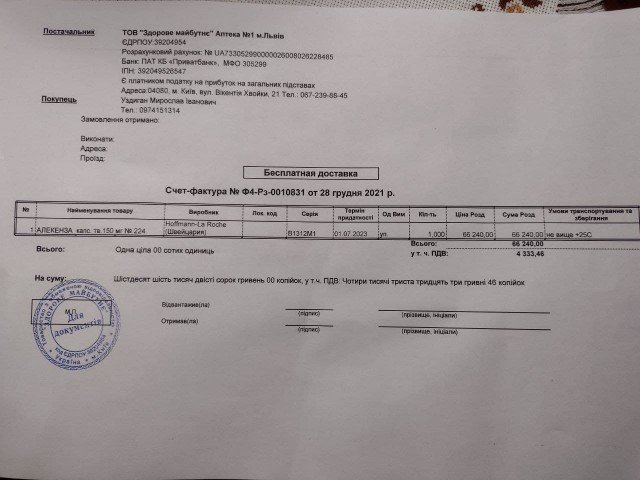 «Вже рік ми так лікуємось. Трошки самі купували, доки були власні кошти, частину за кошти небайдужих людей, адже я веду збір через соцмережі. Ліки потрібно приймати щодень, кожні 12 годин і пожиттєво... Викуп кожної наступної упаковки на початку місяця. Наразі чоловік веде досить активний та повноцінний спосіб життя. Алекенза однозначно допомагає! Тому я прошу всіх небайдужих людей, у кого є можливість, допомогти з купівлею цього препарату для Мирослава», – звертається до людей Світлана.