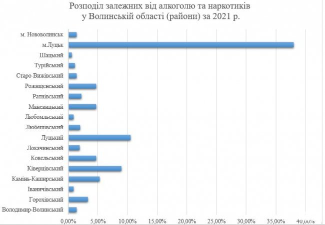 Лідери за кількістю алко- та наркозележних – місто Луцьк (38%), Луцький (10,5 %) та колишні Ківерцівський (9%) і Камінь-Каширський райони (5,3%). А найнижчий показник – серед жителів колишнього Шацького району (0,6%). До слова, раніше алкогольне лідерство тривалий час утримував колишній Локачинський район.