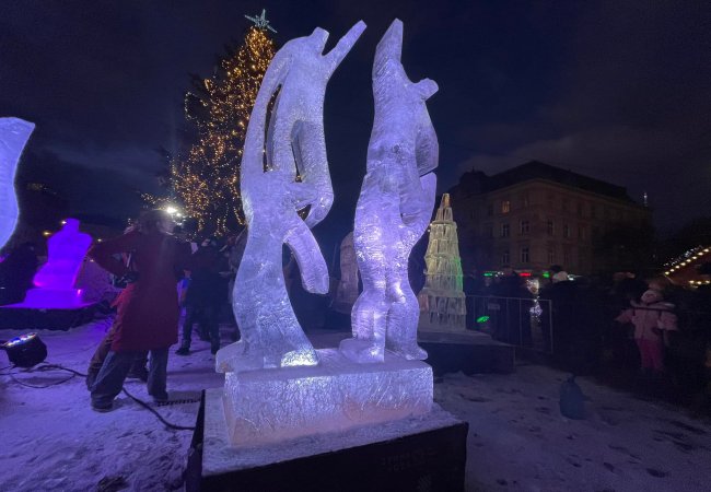 Ангел, хлопець який стоїть на голові, вогонь зі сніжинкою, ялинка з пластинок і крилатий танець: п’ятеро майстрів два дні творили з криги скульптури. Тесали лід не зважаючи на погоду. Вчора вдень було +2. Потім здійнялася буря, сильний вітер та сніг, але скульптури встояли. Серед них уже обрали найкращу. Оцінювали за так званою античною системою: коли учасники голосують за роботу колег. Крім того, голосувало ще двоє членів журі.