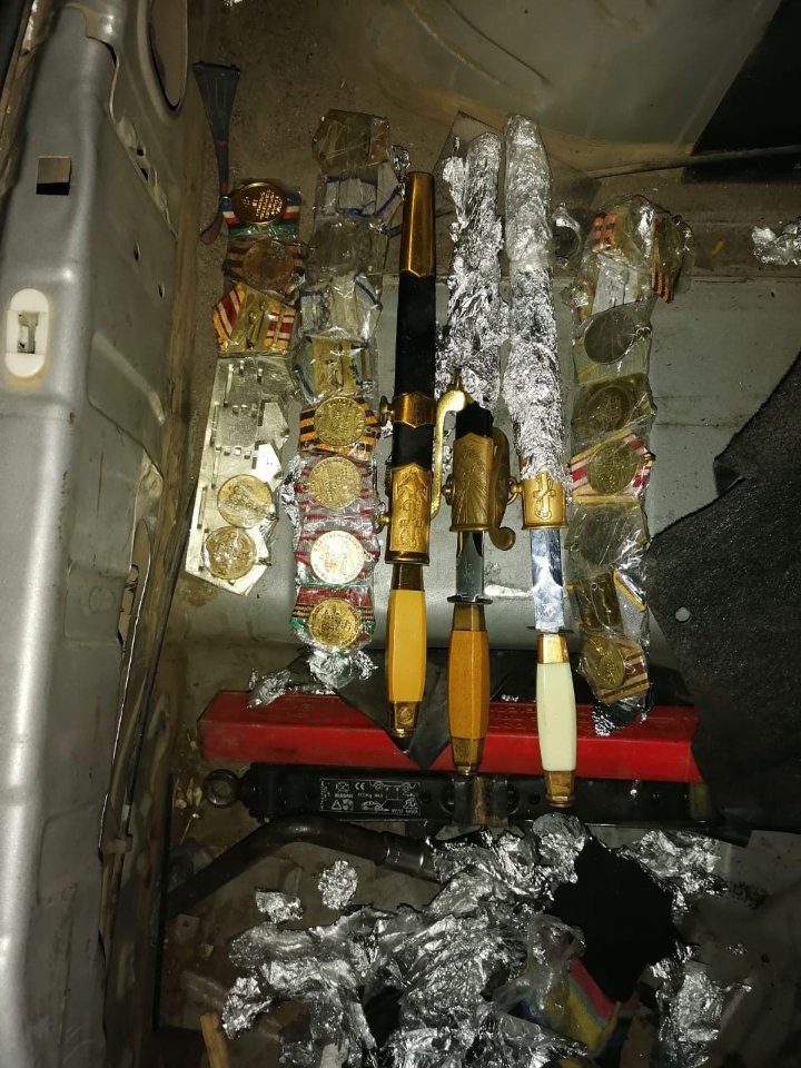 Офіцерські кортики морські, медалі та ордени часів Радянського Союзу іноземець сховав під обшивкою багажника. Крім того, правоохоронці знайшли в автомобілі 13 монет 1922-1925 років, радянські нагородні документи та друковані видання.