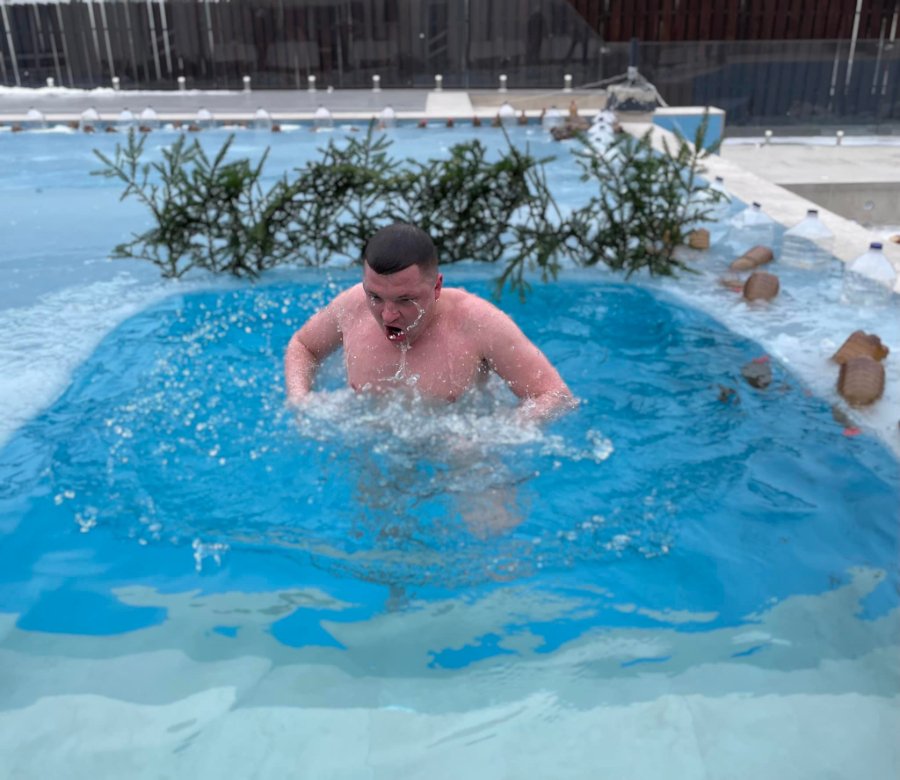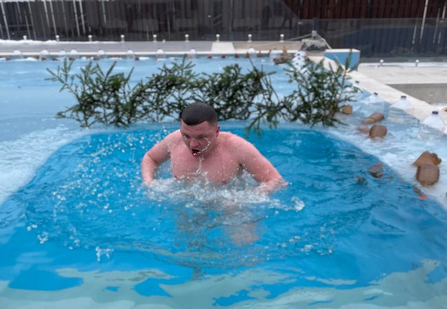 Депутат, голова фракції «Громадянський Рух «СВІДОМІ» у Луцькраді Тарас Шкітер занурився у крижану купіль у басейні готельно-ресторанного комплексу Makis.