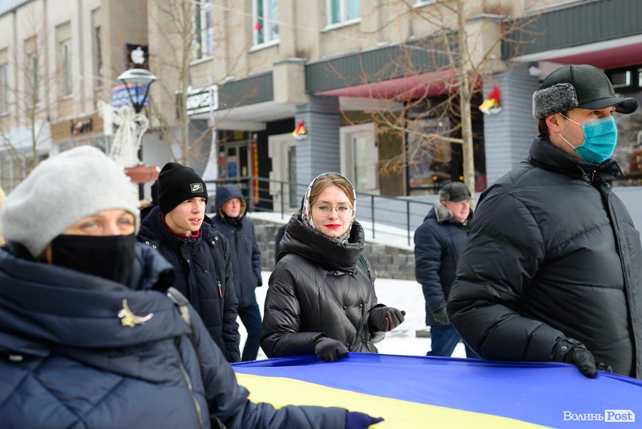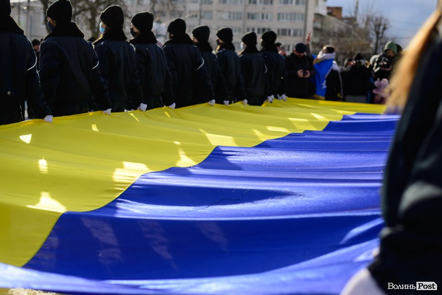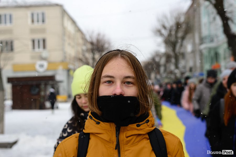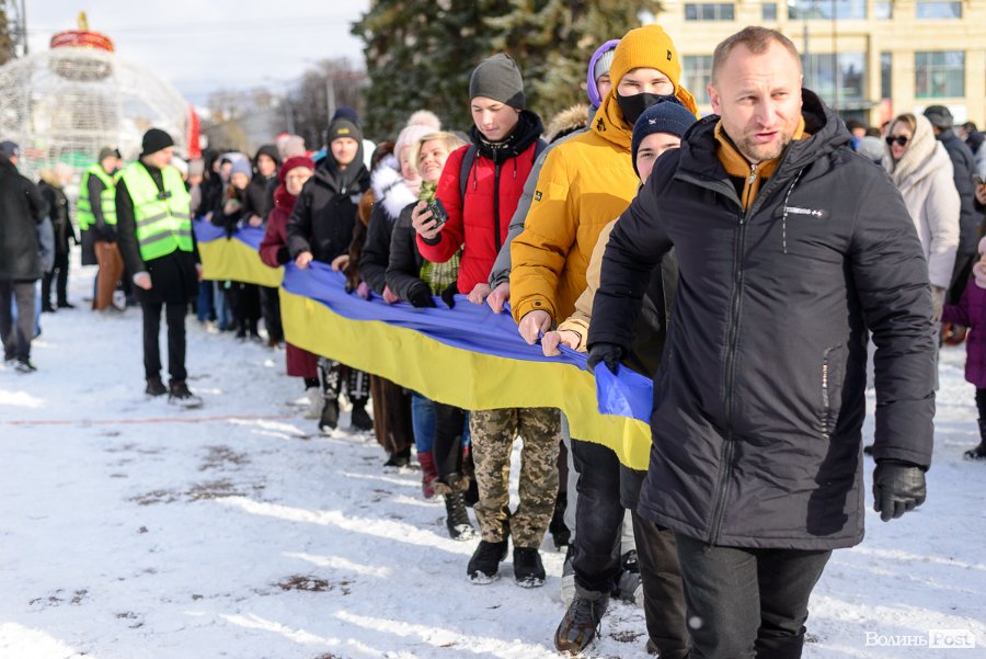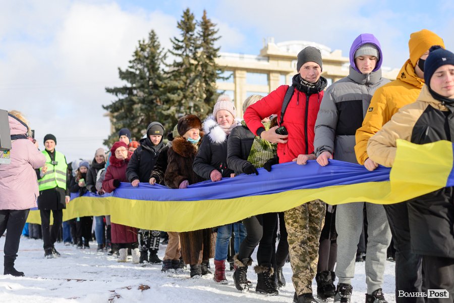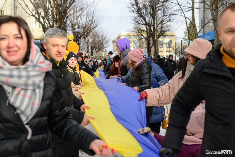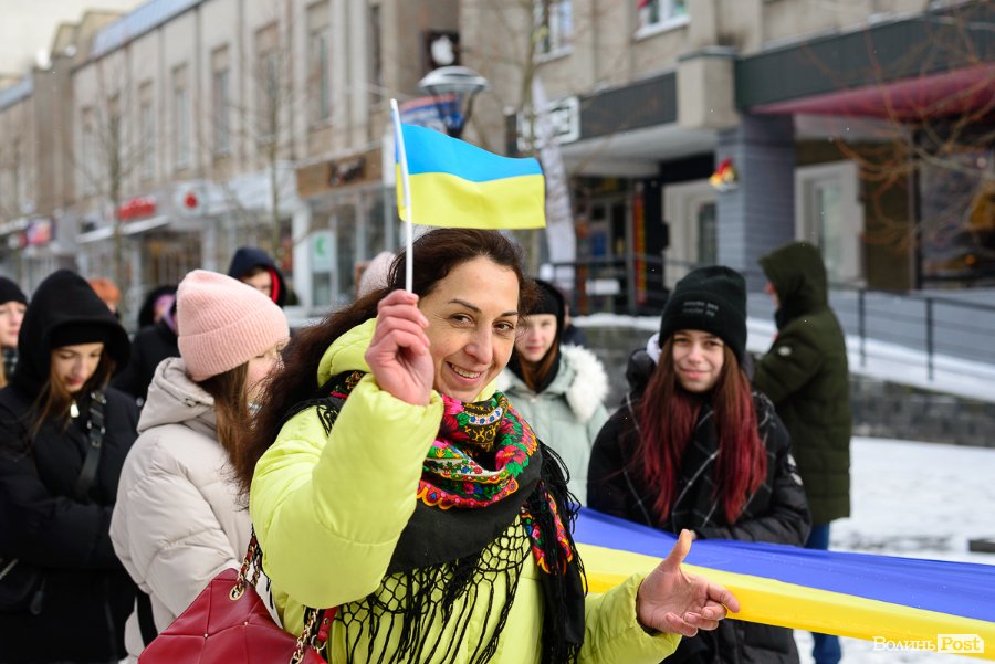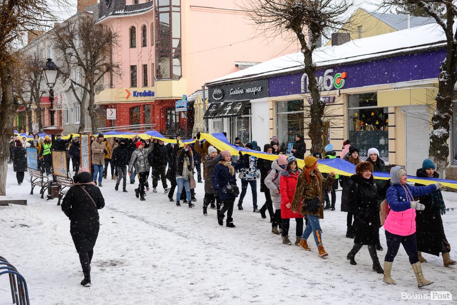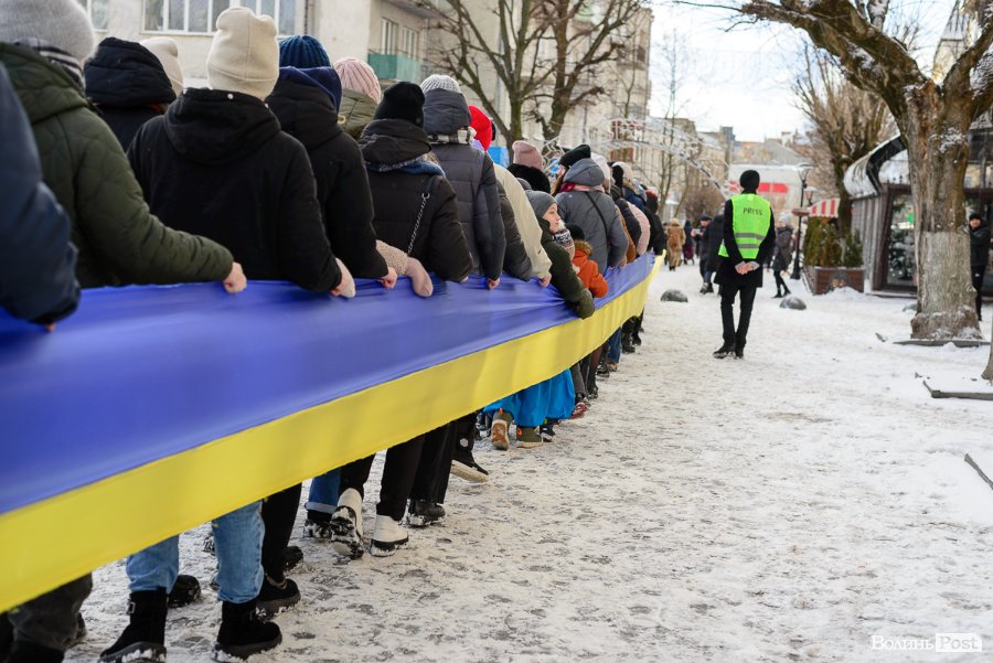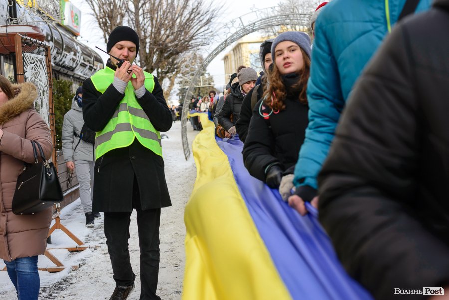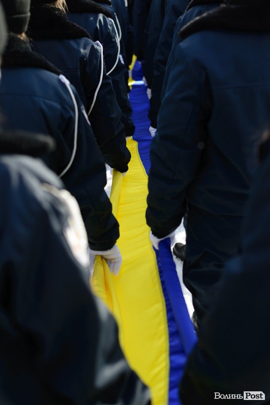 Сотні лучан сформували ланцюг за допомогою 200-метрового прапора від Театрального майдану і майже до кінця вулиці Лесі Українки.
