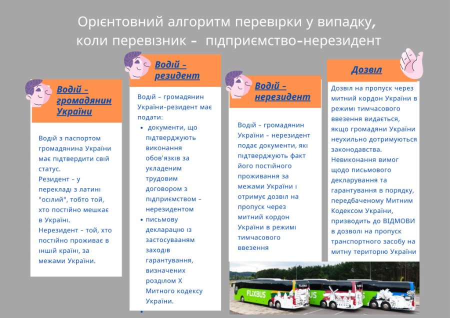 Волинська митниця вкотре наголошує: відповідно до роз'яснень Державної служби України з безпеки на транспорті, використання транспортних засобів, які зареєстровані в іноземних державах, під час проводження господарської діяльності підприємством - резидентом, НЕ МОЖЛИВЕ. А у випадку, коли за кермом такого транспортного засобу знаходиться громадянин України, дозвіл на його пропуск на митну територію Україну видається за таким алгоритмом: