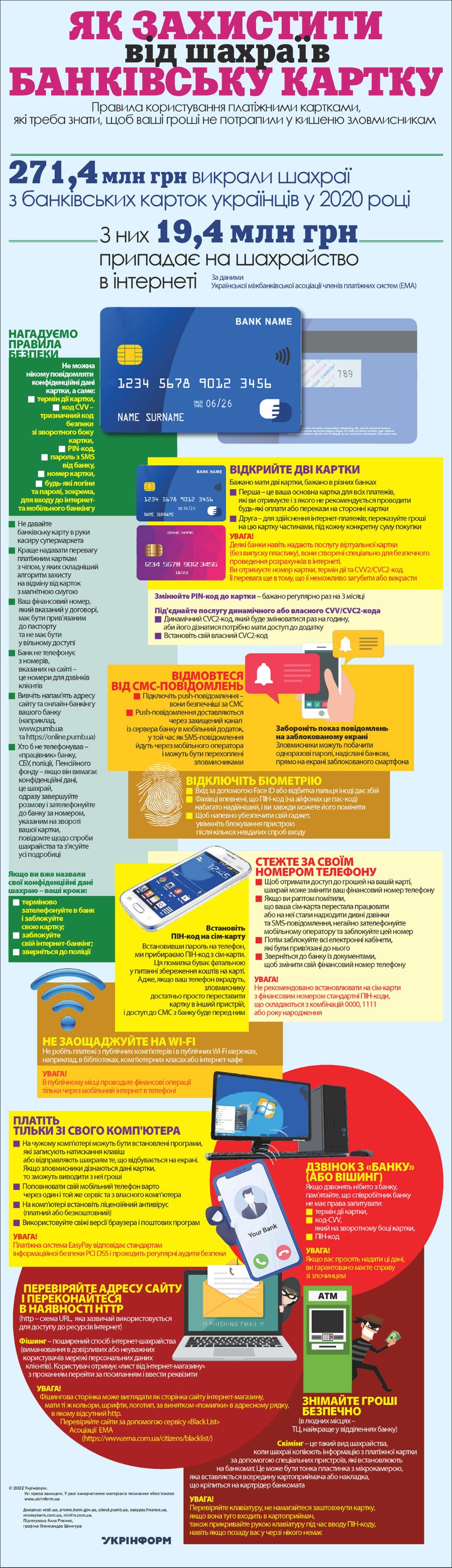 Не можна нікому повідомляти конфіденційні дані картки, відкрийте дві картки - основну і для інтернет-платежів, регулярно змінюйте PIN-код до картки, відмовтесь від СМС-повідомлень, відключіть біометрію, встановіть PIN-код на сім-картку, стежте за своїм номером телефону, платіть тільки зі свого комп'ютера та знімайте гроші у безпечних місцях.