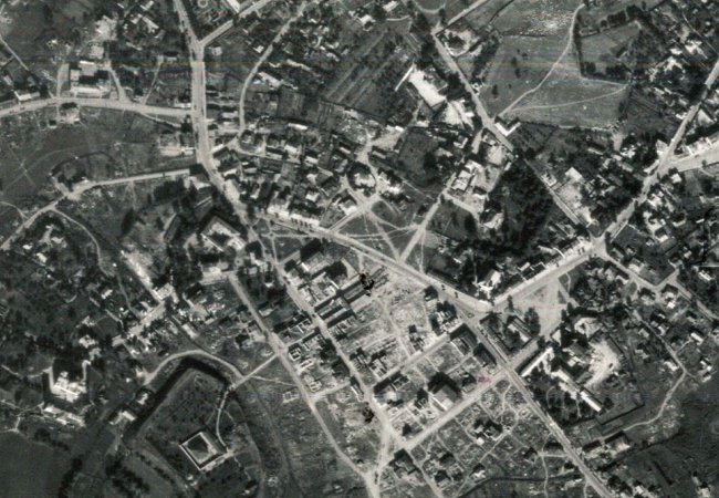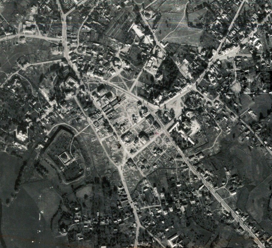 Фотографія № 3 - м. Володимир. Знімок зроблений 18-го вересня 1944 року. Насамперед помітні масштабні руйнування єврейського штетлу, який знаходився між замчищем і Ринковим майданом. Тут видно Велику синагогу, яка під час війни була лише пошкоджена, а зруйнована вже у 1951 році. На цьому фрагменті фото добре видно Успенський собор, соборну дзвіницю, домініканський монастир, каплицю св. Володимира, замчище з в'язницею посередині, критий ринок, неіснуючі сьогодні торгові ряди, парафіяльний костел і зруйновану після війни дзвіницю перед ним, колишнє повітове староство, єзуїтський костел з монастирем, лютеранську кірху, Василівську церкву, русло річки Смоча.
