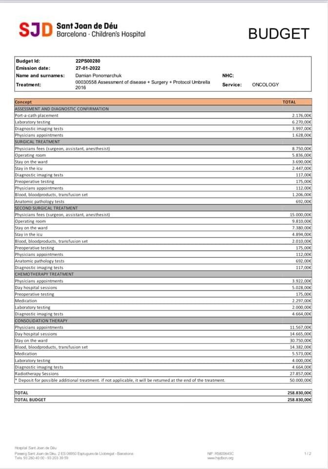 «Донедавна наш хлопчик займався плаванням, відвідував садочок та вів активний спосіб життя… Сьогодні ж його майбутнє під великою загрозою страшної хвороби.(( Молю, прошу знайомих та незнайомих про допомогу! Чи не єдиний шанс на одужання нам дає один з найкращих госпіталів Європи - Sant Joan de Deu в Барселоні. Попереду ряд операцій, сеанси хіміотерапії та променевої терапії», – зазначає мама.