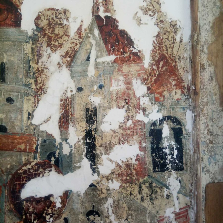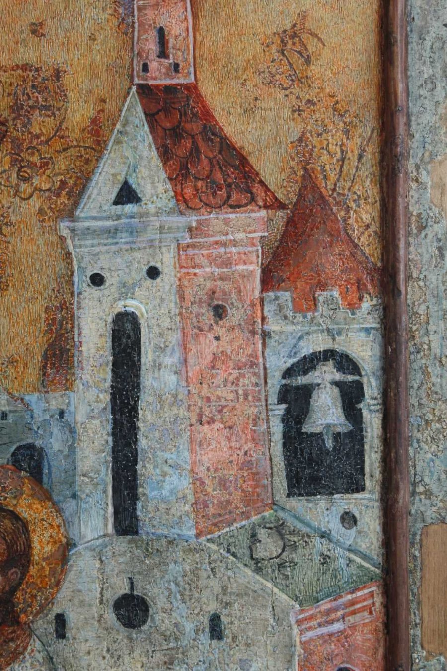 Стіни храму та веж іконописець прикрашає ледь прописаними карнизами, пілястрами, круглими та аркоподібними вікнами. Колорит пам’ятки відповідає іншим творам маляра. Тут домінує вохра різних відтінків, біла та блакитна фарби. Тонка чорна лінія окреслює лики і постаті персонажів.