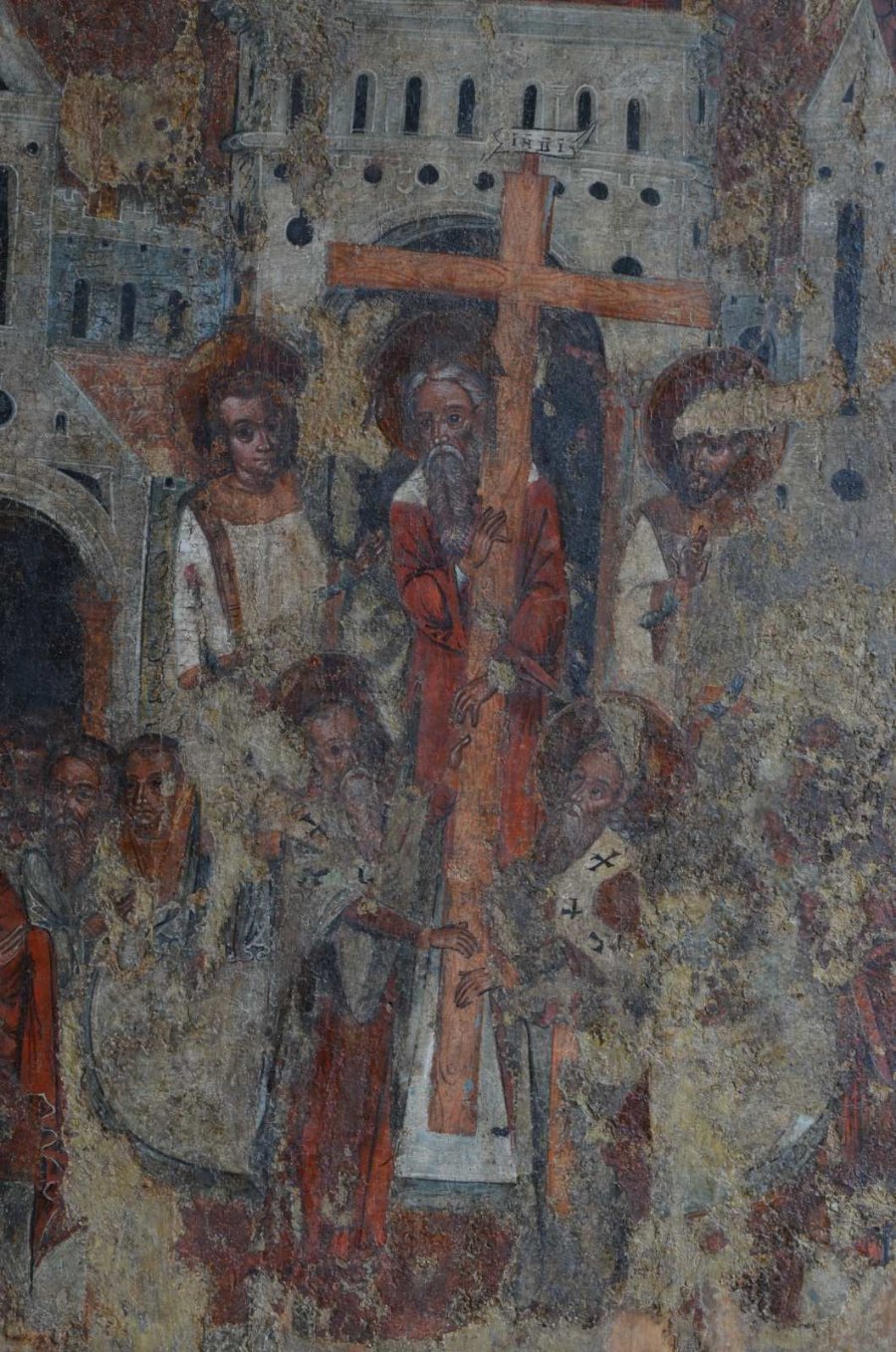 Нижня частина ікони найбільш постраждала від часу. Серед натовпу виділяється постать царя Костянтина. В іконі, як і у інших творах майстра, велика роль відводиться архітектурі. Масивні споруди з центральним храмом, двома вежами і дзвіницею з підвішеним дзвоном з’єднані високими стінами.