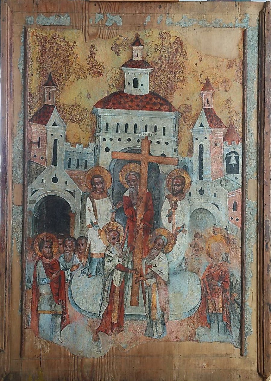 Живописний шар ікони «Воздвиження Чесного Хреста» знаходився у незадовільному стані: осипи левкасу до дошки, втрачені композиційні частини, стійке пилове забруднення. Через свій стан ікона довгий час знаходилася на реставрації, адже реставраційний процес був складним.