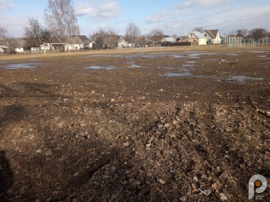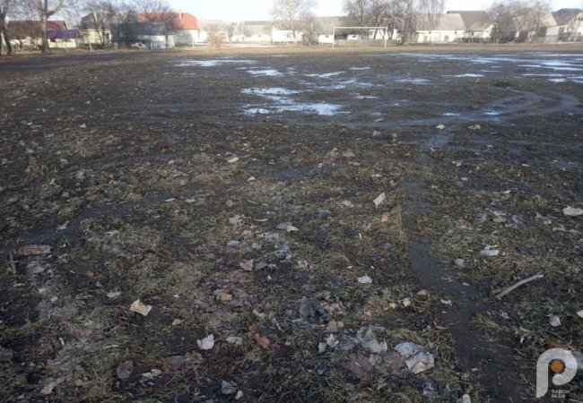 Поле для футболу стало схоже на «земляну кашу». Замість хорошого покриття на ньому видно утворилося чимало дрібних колій.