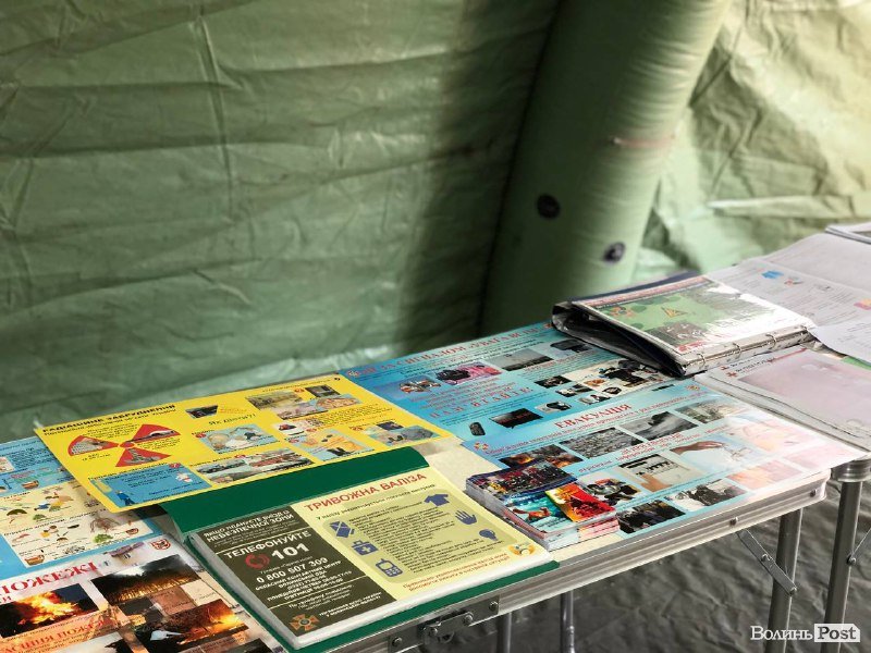 У наметі є три локації: столик із інформативними листівками-пам'ятками, консультації з приводу вибухо-небезпечних придметів та домедичної допомоги.