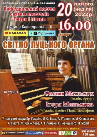 У Кафедральному костелі святих апостолів Петра і Павла відбудеться концерт «Світло луцького органа». Творитимуть вишукану атмосферу артисти зі Львова Олена Мацелюх та Ігор Мацелюх.