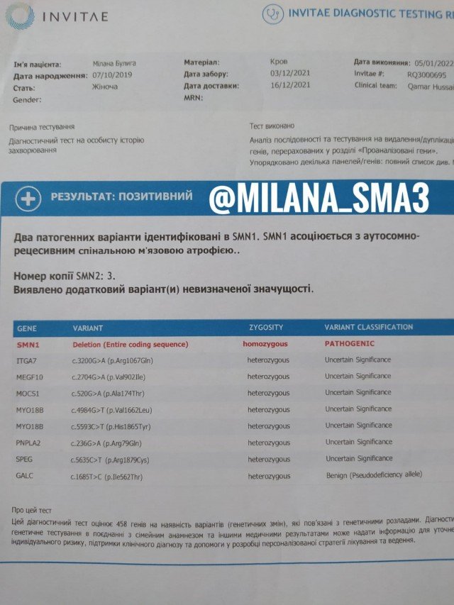 У пошуках відповіді батьки з донькою яких тільки лікарів не пройшли і які тільки аналізи й тести не здавали. Педіатри, дитячі невропатологи, перевірка м’язової активності, МРТ голови – жоден фахівець і жоден апарат не могли знайти хоча б якихось відхилень від норми. А тим часом стан дитини поступово погіршувався. Зрештою її направили на генетичний аналіз, результату якого довелося чекати аж місяць. І він прозвучав як вирок – у Мілани виявили спінальну м’язову атрофію третього типу.