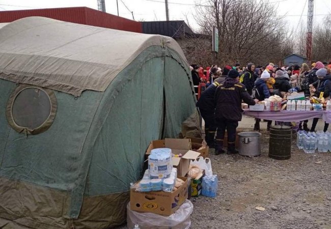 Намети ДСНС розгорнуті в населених пунктах біля дороги поблизу кордону, де люди можуть відпочити, випити чаю отримати їжу.