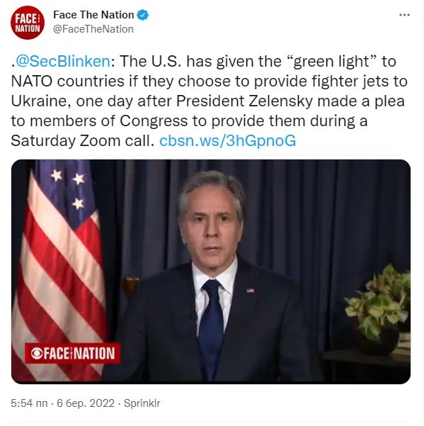 "США дали "зелене світло" країнам НАТО, якщо вони вирішать надати винищувачі України", – сказав держсекретар Сполучених Штатів Ентоні Блінкен.