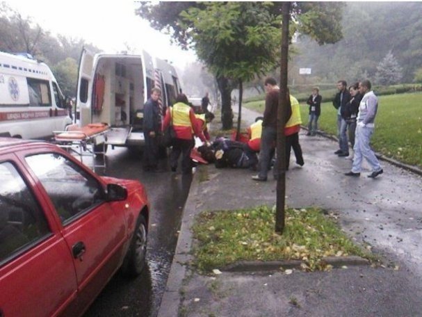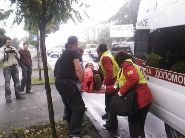 Лікарі, які приїхали на допомогу постраждалим, оглянули їх на тротуарі, а потім на носилках занесли до карети "швидкої".