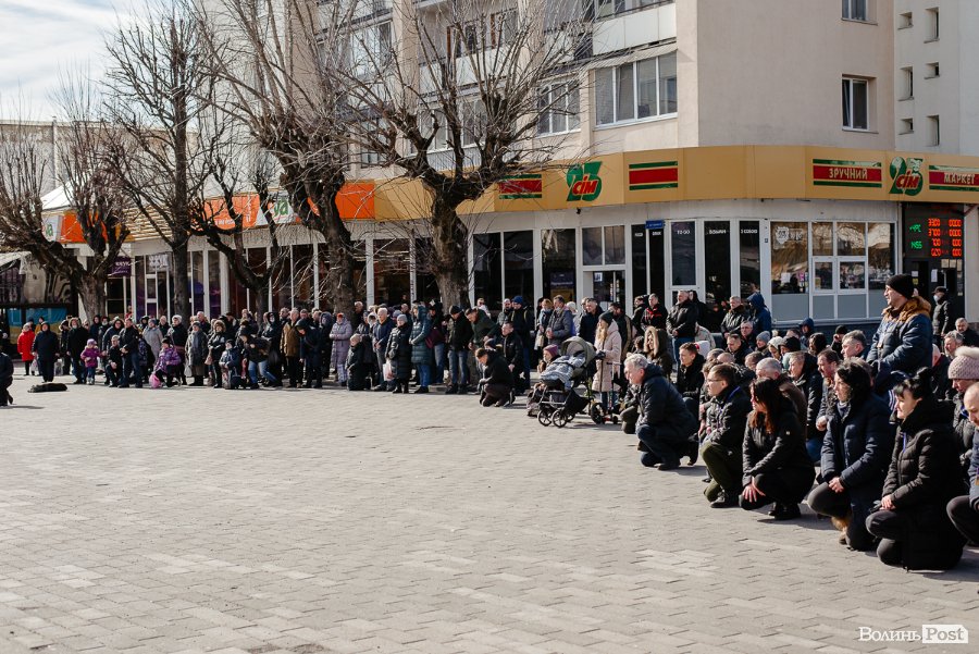 Колона вирушила на Театральний майдан, де усі на колінах віддали останню шану військовим за їхній захист міста.