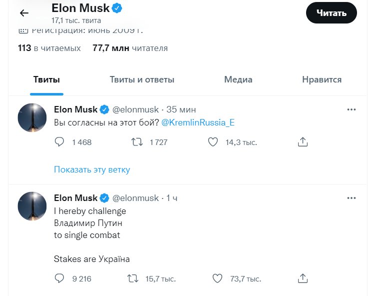 "Я кидаю виклик Володимиру Путіну. В єдиноборстві. Ставка - Україна", - написав Маск у Twitter.