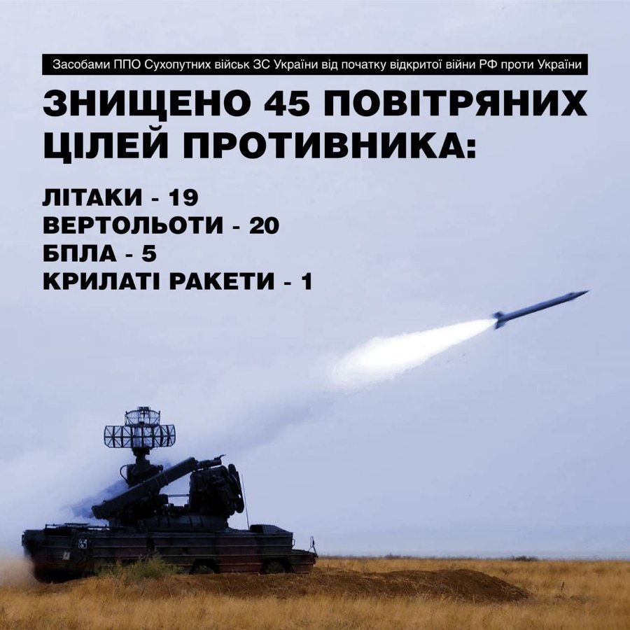 Сухопутні війська України від початку повномасштабної війни, яку Росія розв'язала проти України, знищили 45 повітряних цілей. Ідеться про використання засобів протиповітряної оборони.