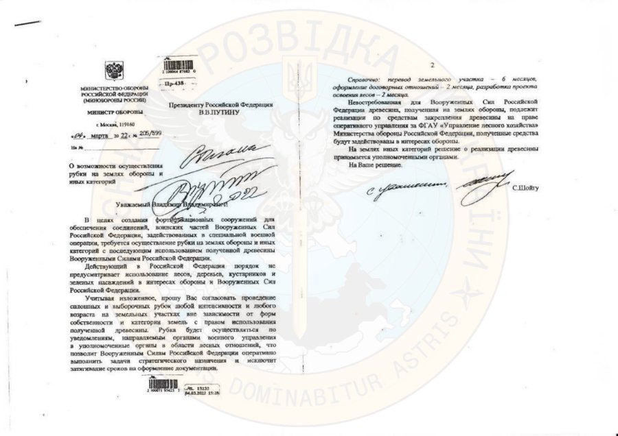 Про це йдеться в листі міністра оборони Росії Шойгу «Про можливість вирубки на землях оборони», який адресований особисто Путіну, інформують у Головному управлінні розвідки Міністерства оборони України.