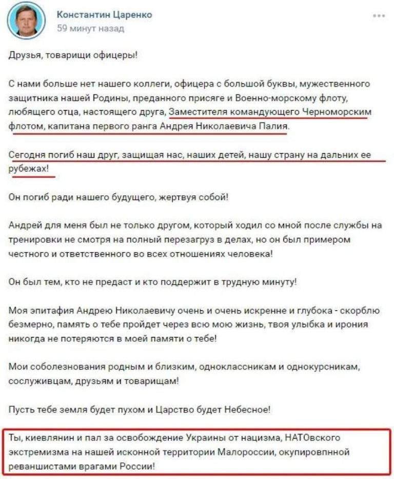 "Стало відомо, що вчора українській армії вдалося ліквідувати двох високопоставлених командирів: це заступник керівника Чорноморського флоту з промовистим прізвищем Палій. Ця людина відповідала за ідеологічну роботу", – розповів радник міністра.