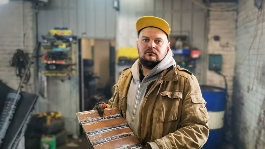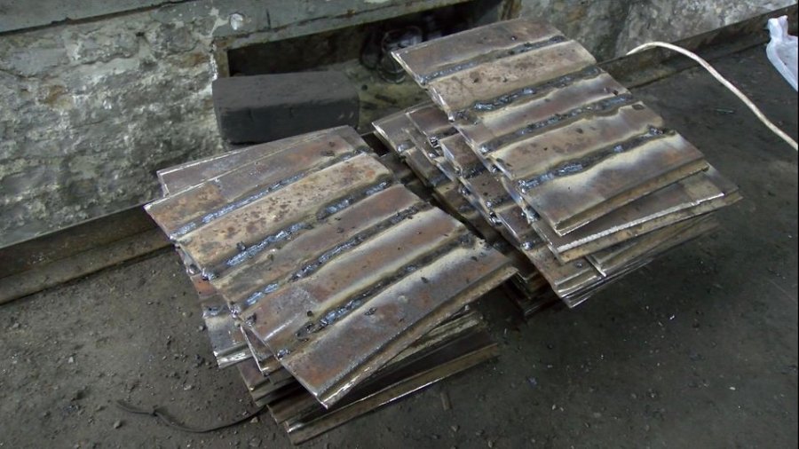 Під час виготовлення захисних пластин волонтери спершу нарізають елементи. Метал беруть із пружинної частини підвіски вантажівок. Далі зварюванням деталей займається механік-інженер Павло Гончаров.