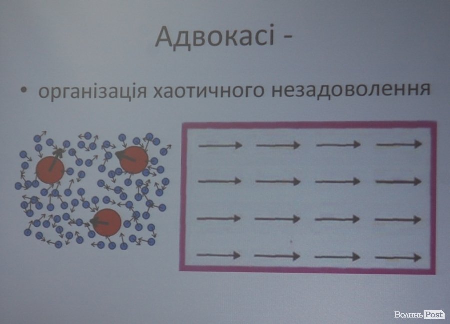 Як розповів експерт Житомирського обласного центру молодіжних ініціатив Михайло Городок, під час вирішення різноманітних конфліктних питань між громадою і владою можна скористатися технологією адвокасі. Вона містить в собі дві складові: юридичну і піар.