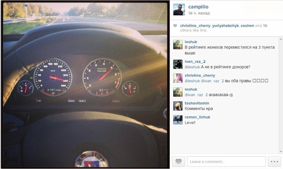 Це фото на його сторінці в Instagram свідчить про нову моду серед золотої молоді – хизування швидкою їздою. Тільки от ця гра у «хто швидше?» не завжди закінчується добре. Детальніше про це може розповісти син власника рівненського льонокомбінату Дмитро Червонюк, котрий нині знаходиться у СІЗО за те, що насмерть збив людину. То чи вартують таких наслідків ці «понти»?
