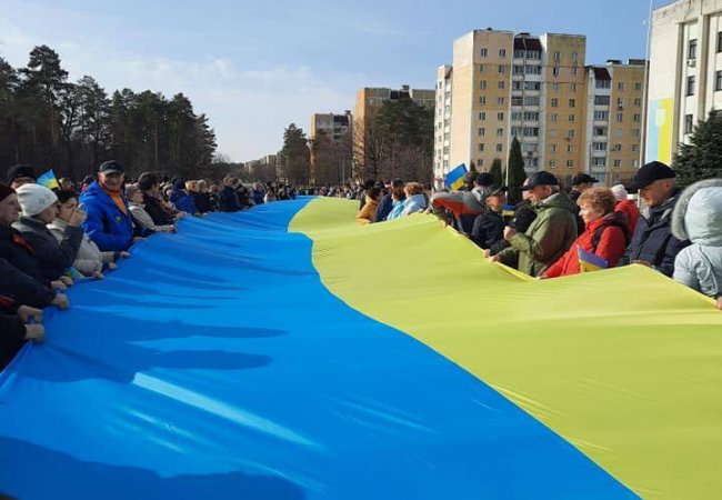 Зауважимо, що жителі Славутича вийшли на проукраїнський мітинг з національною символікою. Вони зібралися на головній площі, розгорнули великий державний прапор та скандувати "Славутич – це Україна", "Слава Україні".