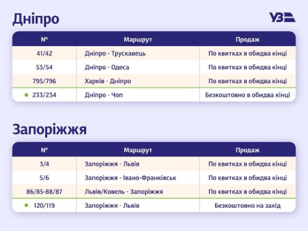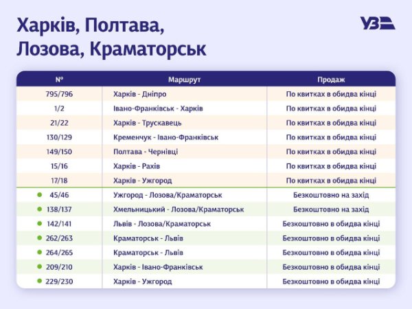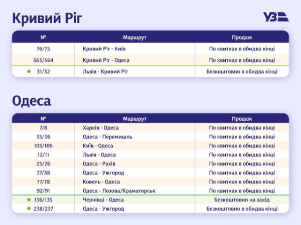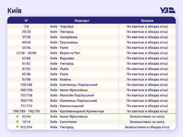 Квитки можна придбати у залізничних касах, на сайті, у Viber-боті, у Telegram-боті, у Facebook Messenger, у Apple Messages.