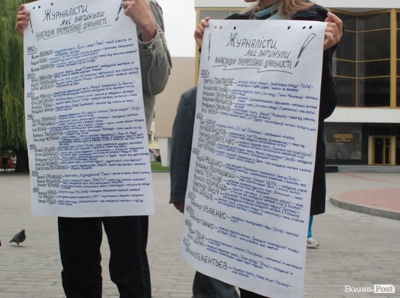 Учасники акції тримали в руках великі аркуші паперу з переліком журналістів, які загинули за роки незалежності України. А дехто тримав листи з надписами штибу "Вимагаємо правосуддя".