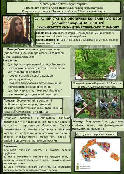 Предмет наукової роботи Вікторії – дослідження стану популяції конвалії травневої не території Скулинського лісництва. Світлана Савченко розповідає, що конвалія травнева – лікарська рослина, яка дуже поширена у місцевому лісництві. Окрім того, це улюблена рослина Вікторії, тож дівчина вирішила досліджувати саме її.