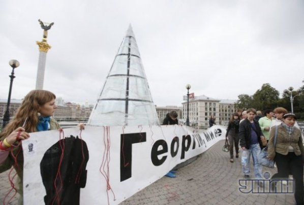 Активісти громадянського руху "Відсіч" розгорнули банер з написом "Георгій, ми не забули!" на мосту біля Жовтневого палацу в Києві, - пише ТСН з посиланням на УНІАН.