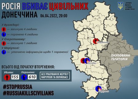 Сьогодні, 6 квітня, російські окупанти обстріляли мирних жителів Вугледара, коли ті стояли у черзі за гуманітарною допомогою. Внаслідок обстрілу загинуло четверо людей, ще четверо - поранені.