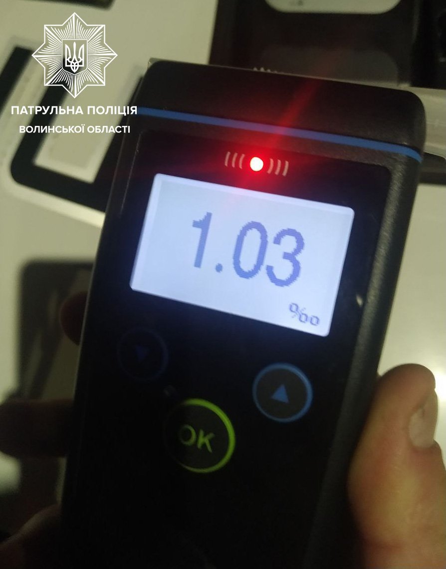 25-річний кермувальник пройшов огляд на визначення стану алкогольного сп’яніння на місці зупинки. Результат — 1,03 проміле, що перевищує допустиму норму в 5 разів.