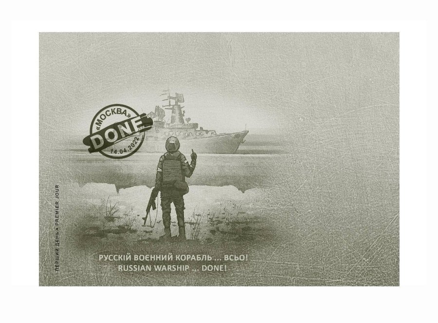 «Укрпошта» показала нову поштову марку із серії «Русскій воєнний корабль». Після потоплення крейсера «Москва» та успіх попередньої марки підпис дещо змінили.
