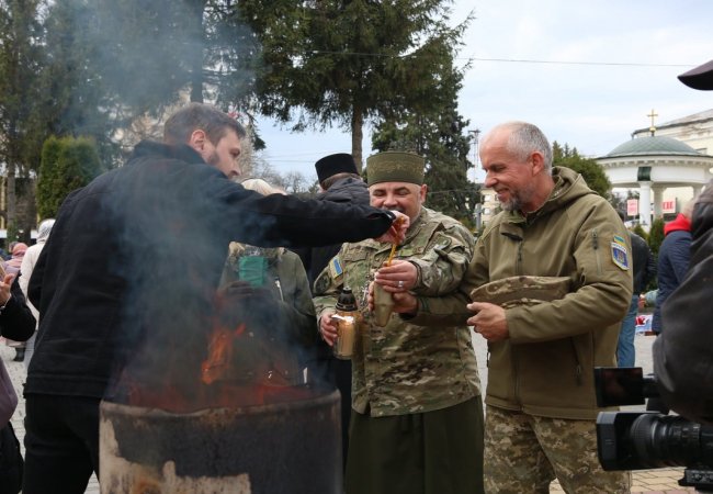 Вогонь у Луцьк волонтери привезли з Донбасу о 18:00. Він він горить на площі перед собором, де люди освячували великодні кошики.